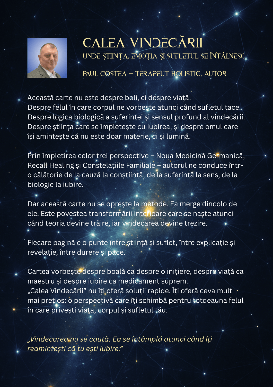 Această lucrare reunește trei dimensiuni fundamentale – biologia, emoția și sufletul – într-o viziune unitară asupra ființei umane. Vei descoperi aici logica profundă a corpului, limbajul emoțiilor și ordinea invizibilă care guvernează sănătatea.